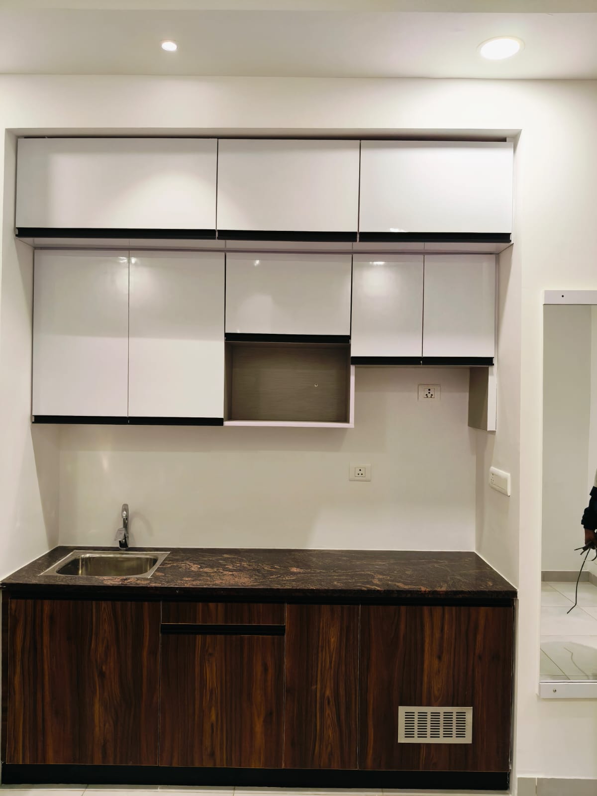 - Kitchenette Makeover White upper cabinets paired with deep wood lower modules create a timeless look. The black marble countertop and stainless steel sink add elegance and durability.