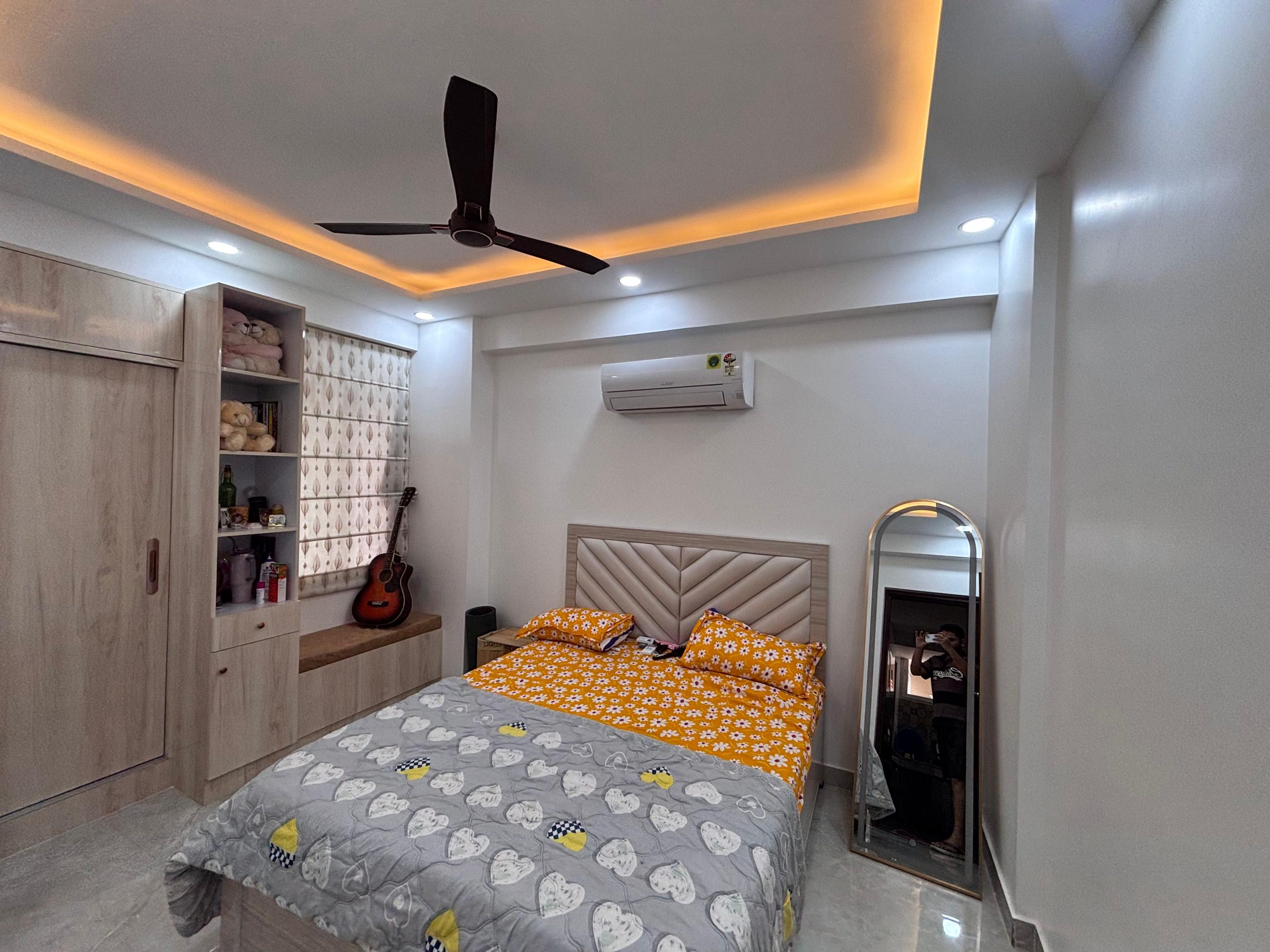 In the living room, twin grey sofas paired with marble-topped tables offered visual balance, while layered curtains managed natural light beautifully. The media wall combined matte textures, floating storage, and concealed wiring to preserve minimalism. Bedrooms were treated as personal sanctuaries, blending smart storage with expressive elements like guitars, bookshelves, and plush decor.